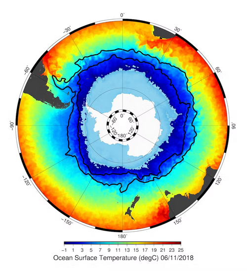 - Положение планетарной Антарктической фронтальной зоны по данным температуры поверхности океана, измеренная спутниками и проанализированная Европейской морской службой Copernicus. Протяженность морского льда вокруг антарктического континента в этот день отображается голубым цветом. Две черные линии указывают долгосрочное положение южного и северного фронтов Антарктического циркумполярного течения [Источник: https://theconversation.com/explainer-how-the-antarctic-circumpolar-current-helps-keep-antarctica-frozen-106164].