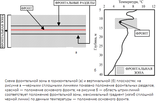 Фронт — линия пересечения поверхности внутри фронтальной зоны, которая совпадает с поверхностью максимального градиента одной или нескольких характеристик [Федоров, 1983]. Это наклонная поверхность раздела между водами с различными физико-химическими и динамическими характеристиками, пересечение которой с поверхностью океана образуют линию фронта. В качестве отличительного признака фронта на поверхности и в глубинах океана обычно принимаются максимальные градиенты океанологических характеристик [Власова и др., 2007].