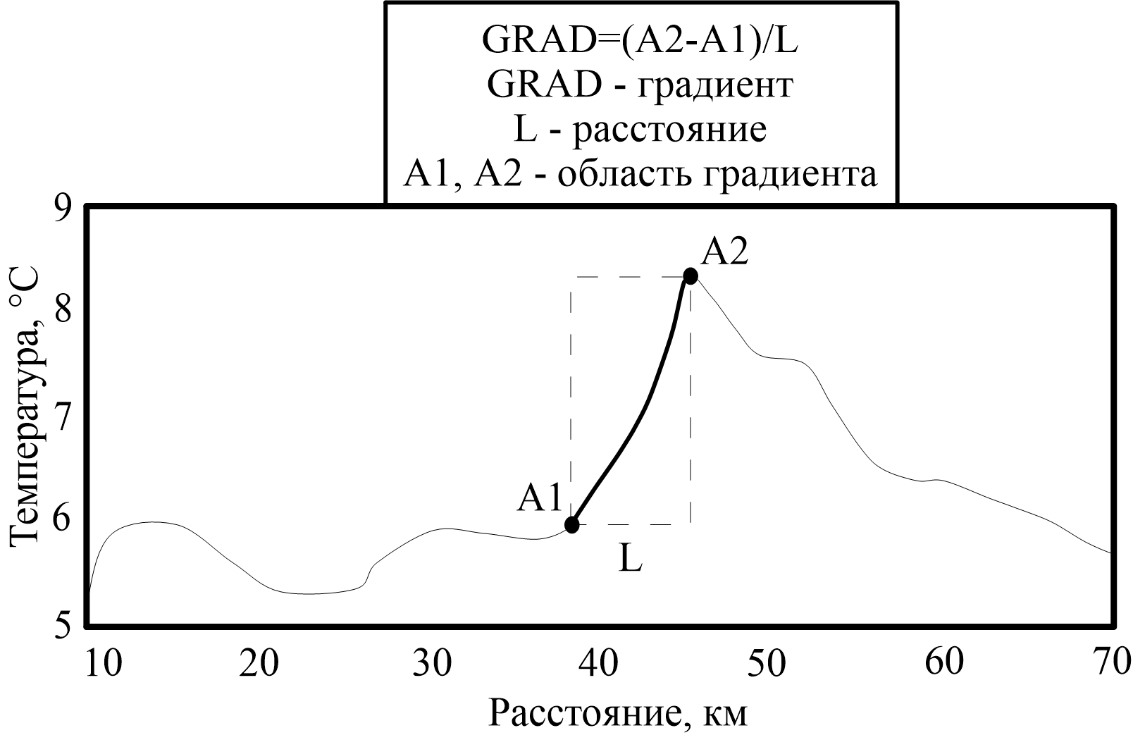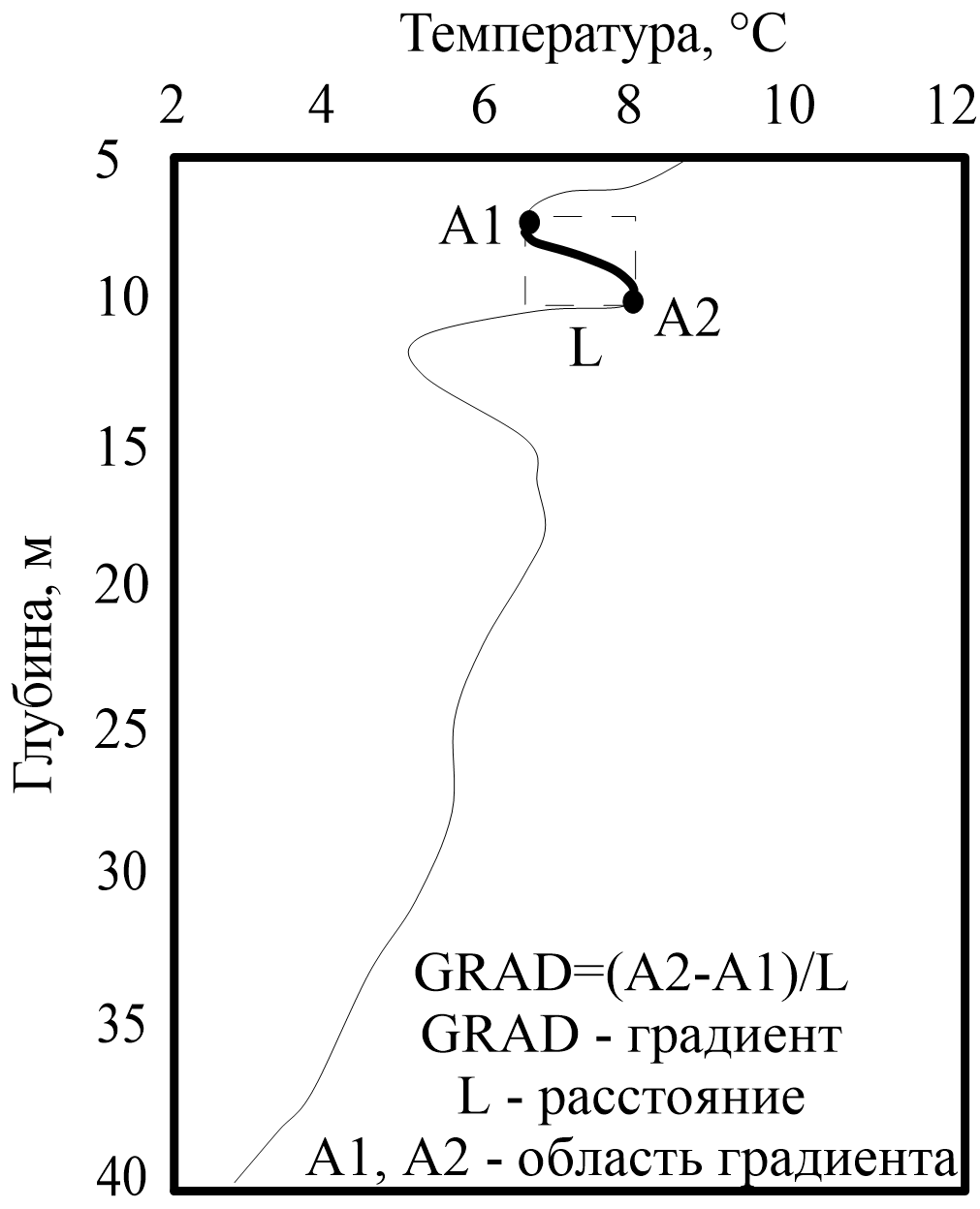 - Схема вертикального градиента по данным температуры в области фронтальной зоны (черная жирная линия): А1 — максимальная температура в области фронтальной зоны, А2 — минимальная температура в области фронтальной зоны, L – расстояние между минимумом и максимумом, GRAD — формула расчета градиента. [Федоров, 1983].