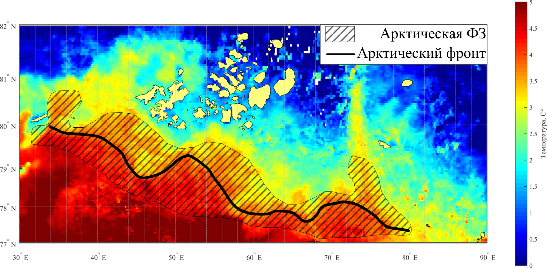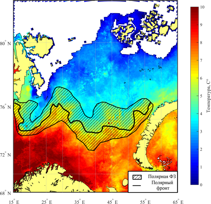 - Положение Полярной фронтальной зоны и Полярного фронта в Баренцевом море по данным температуры поверхности моря [Федоров, 1983; Ожигин и др., 2016].