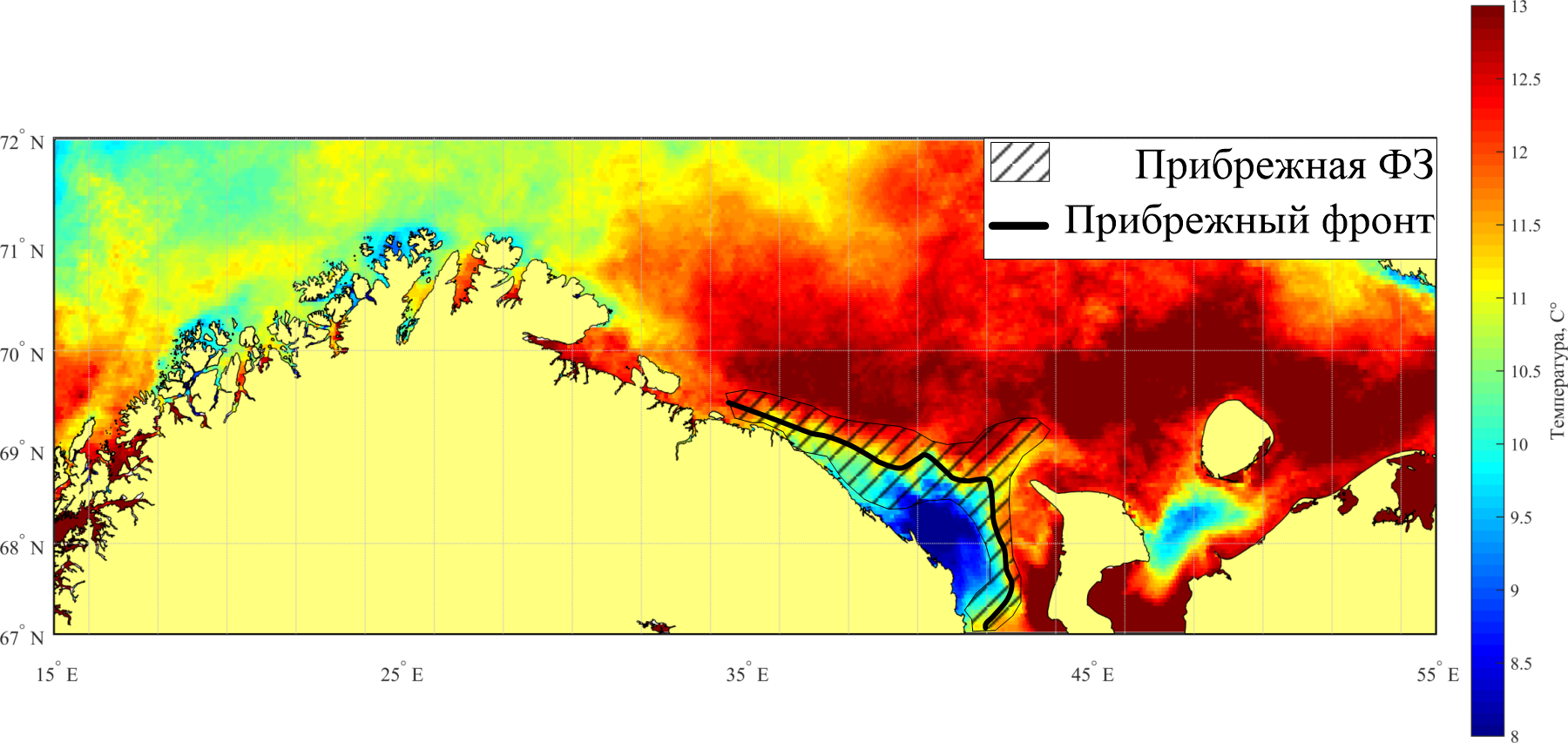 - Положение Прибрежной фронтальной зоны и Прибрежного фронта в Баренцевом море по данным температуры поверхности моря [Ожигин и др., 2016].