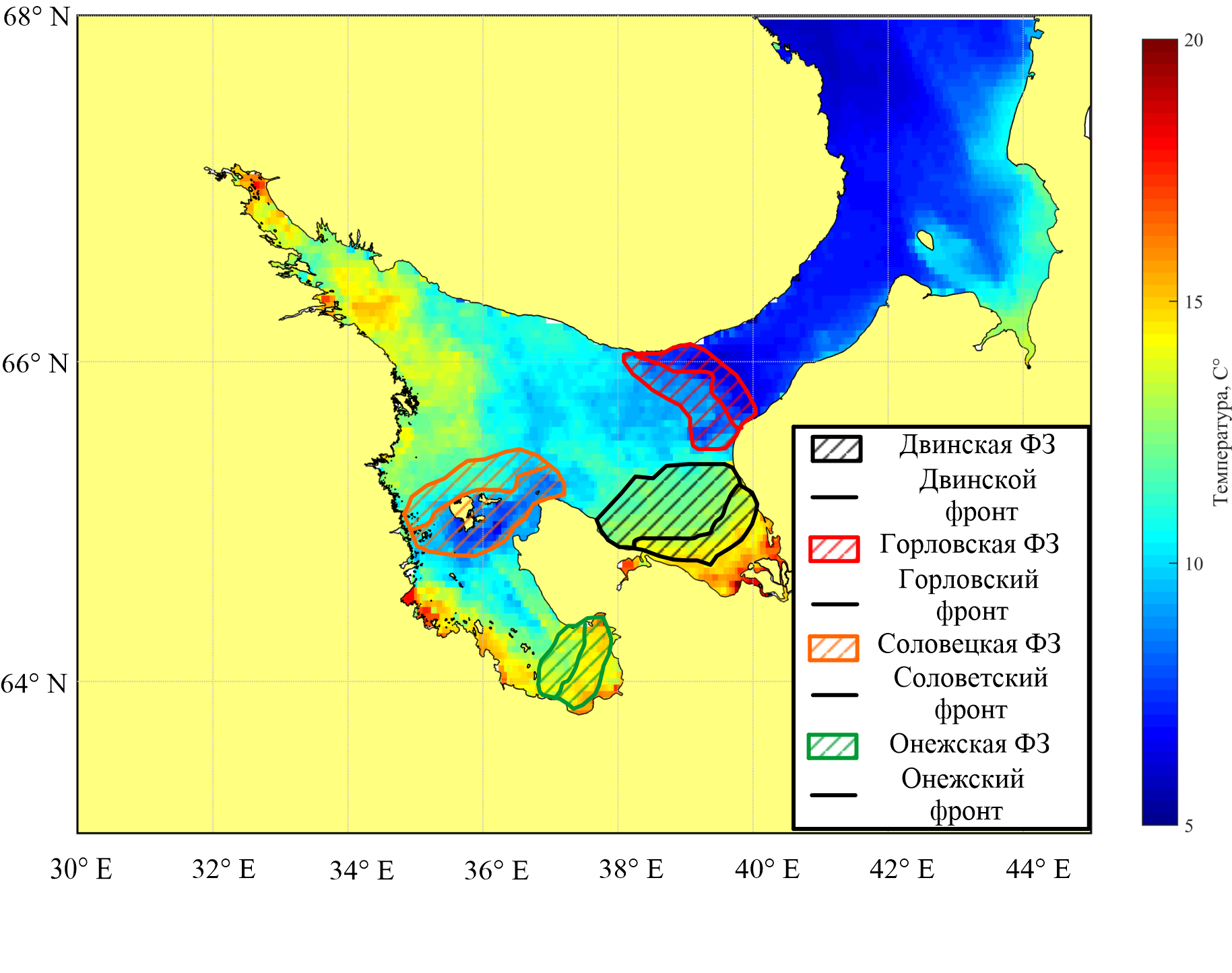 - Положение основных фронтальных зон Белого моря по данным температуры поверхности моря — Двинской (черный), Горловской (красный), Соловецкой (оранжевый) и Онежской (зеленый) фронтальных зон [Романенко и др., 2016].
