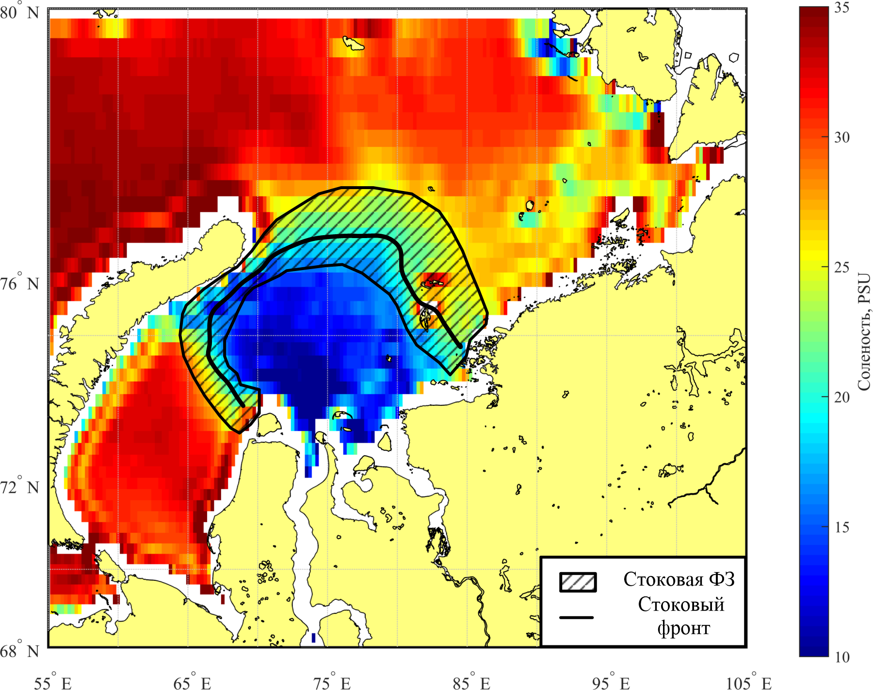 - Положение Стоковой фронтальной зоны в Карском море по данным солености поверхности моря [Романенко и др., 2016].
