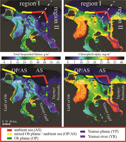- Положение фронтальной зоны в близи устьев Оби и Енисея по данным концентрации взвешенного вещества (слева) и хлорофилла-а (справа) 14 сентября 2011 г. [Osadchiev et al., 2017]. Штриховой белой линией показаны районы I и II, сплошными черными линиями показано примерное расположение фронтальных зон между выделенными типами вод в районе