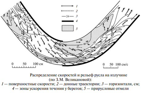 Поле скоростей течения в излучине существенно отличается от прямолинейных участков. Наблюдается смещение максимума скоростей к выпуклому берегу. У вогнутого берега отмечается повышение уровня воды. Как правило, за поворотом русла вдоль выпуклого берега образуется коса, сложенная русловыми наносами.