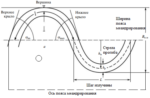 Морфологические элементы и параметры излучин при плавном переходе от одной излучины к другой [Чалов, 2015, с. 268]