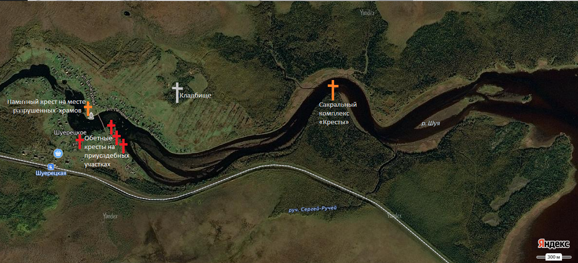 - Обетные и памятные кресты на геоизображении села Шуерецкого. Республика Карелия. По Е. В. Самойловой (2017).
