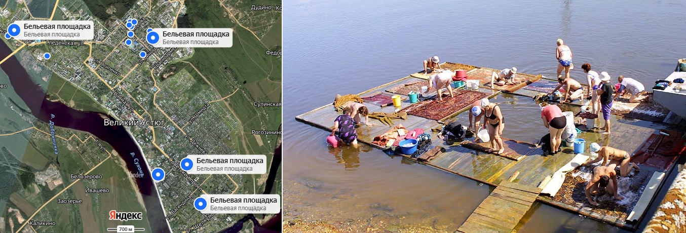 В отдельную группы выделена бытовая лексика стирки белья – в условиях отсутствия современных средств и технологий именно реки и озера позволяли хозяйкам держать дом в чистоте. О сохранении этой архаичной формы водопользования свидетельствуют многочисленные названия мостков, колод и проч., а также установка самих мостков на реках Русского Севера. В современных разговорной речи диалектный термин полоскалка получил новое значение – ‘плот на реке для стирки белья’. В местных сообществах ежегодно обсуждается вопрос о размещении бельевых площадок и их обустройстве.