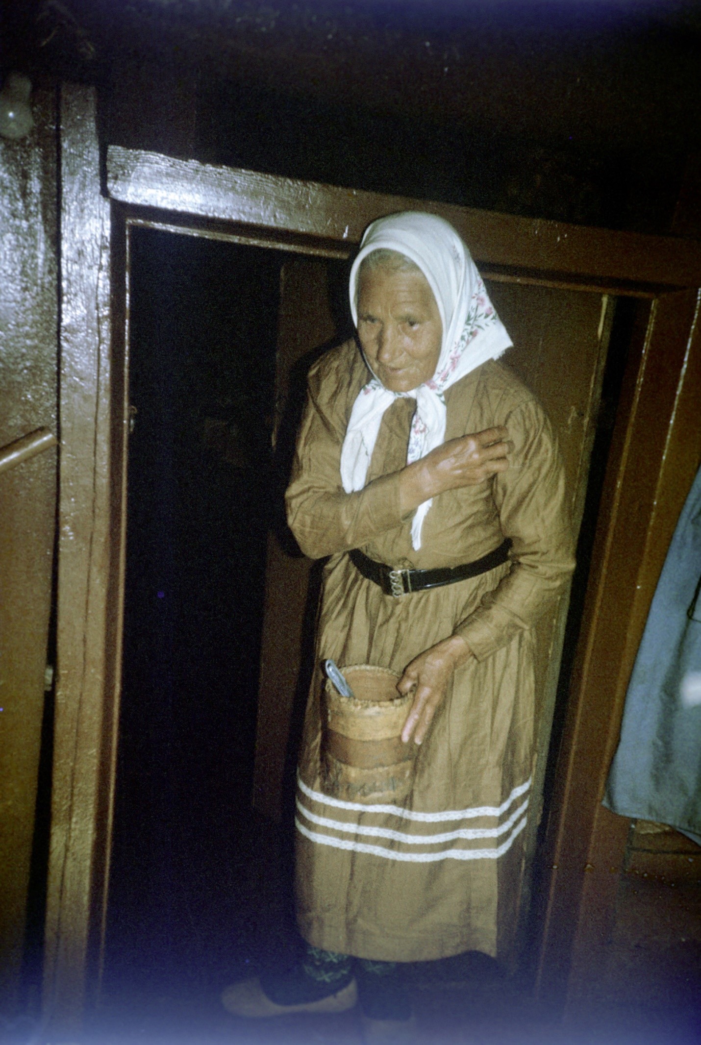 - Знахарка с принесенной с реки водой для заговоров. Фото: В. Балахнов (Архангельская обл., Плесецкий р-н, 1989).