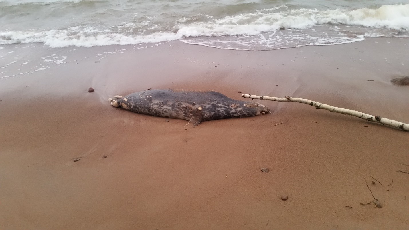- Погибший серый тюлень на берегу Финского залива. Лужская губа у д. Вистино. Фото С. Соколова.