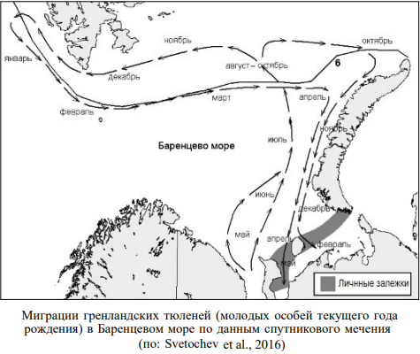 - Миграции гренландских тюленей (молодых особей текущего года рождения) в Баренцевом море по данным спутникового мечения [Кавцевич и др., 2020, с. 201].