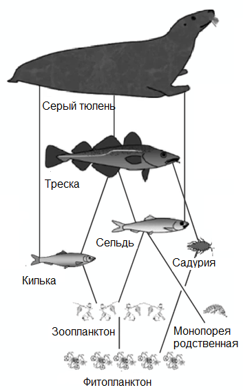 - Пищевая сеть серого тюленя (по Karlson, 2020 с сокращениями). Выше тюленя в пищевой цепи – белый медведь.
