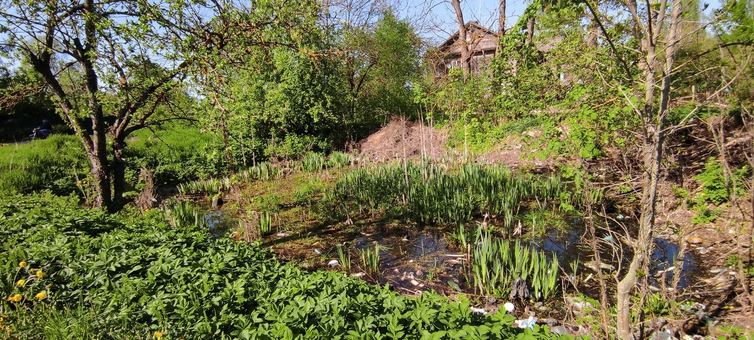 - Заросший пожарный водоем с низким уровнем верховодки. Деревня Старосиверская. 19 мая 2023 г.