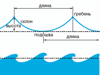 - крутизна (е) — отношение высоты данной волны к ее длине. Крутизна волны в различных точках волнового профиля различна.