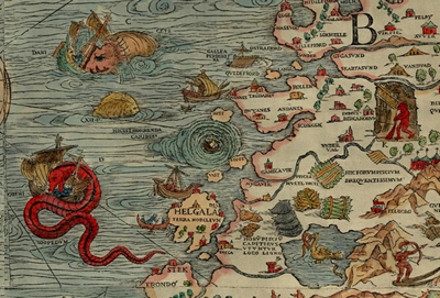- Водоворот Мальстрём на фрагменте карты Carta Marina, созданной шведским церковным деятелем, дипломатом и писателем Олафом Магнусом в 1539 г. [Автор: Олаф Магнус. Фоторепродукция распространяется в соответствии с public domain].