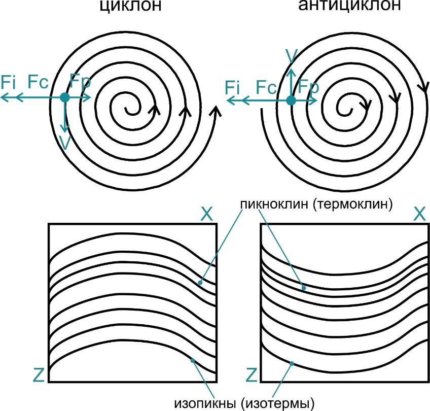 - Схема циклонических и антициклонических вихрей в Мировом океане и связанное с ними типичное положение слоев жидкости.