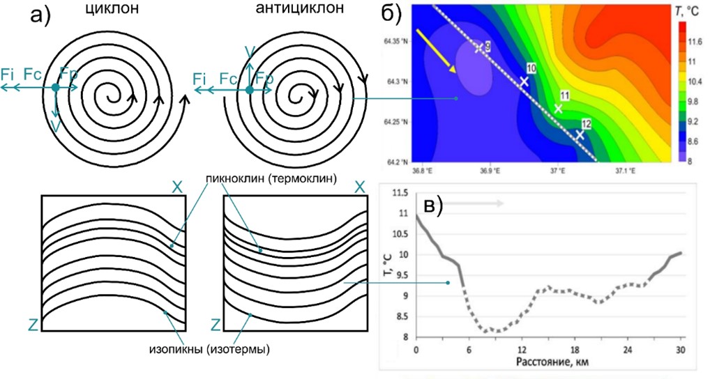 - Субмезомасштабные вихри по контактных данным: а) схематическое представление; б) субмезомасштабный вихрь в Белом море, проявляющийся в распределении температуры на поверхности по данным полигонной съемки в Белом море; в) субмезомасштабный вихрь в Белом море, проявляющийся на разрезе температуры в Белом море [Атаджанова, 2019].