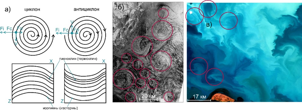 - Мезомасштабные вихри по спутниковым данным: а) схематическое представление; б) проявления вихревых структур в Баренцевом море по оптическим данным (сайт SOLAB) [https://solab.rshu.ru]; в) проявления вихревых структур в Баренцевом море по радиолокационным данным Sentinel‑1 [данные ESA, обработка Е.И. Свергуна].