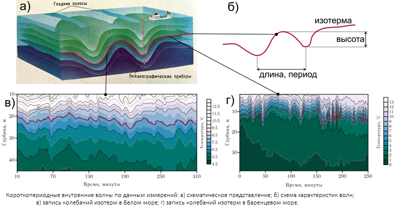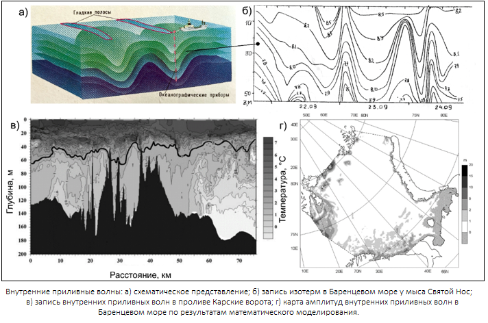 - Внутренние приливные волны: а) схематическое представление [Атлас океанов, 1996]; б) запись изотерм в Баренцевом море у мыса Святой Нос [Серебряный, 2002]; в) запись внутренних приливных волн в проливе Карские ворота [Морозов и др., 2017]; г) карта амплитуд внутренних приливных волн в Баренцевом море по результатам математического моделирования [Kagan, 2014].