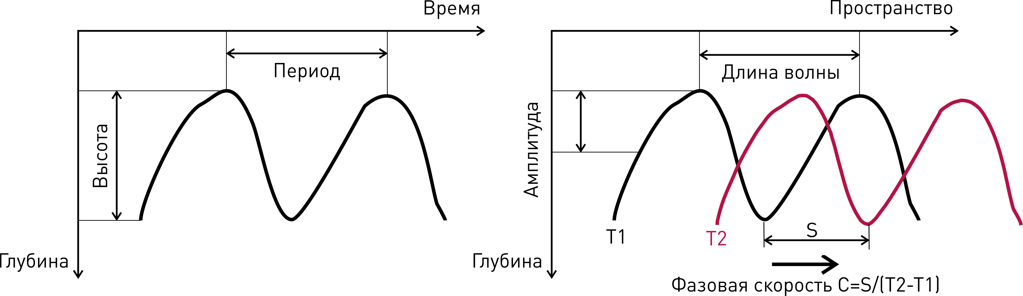 - Схема основных характеристик внутренних волн в координатах времени (слева) и пространства (справа) [сост. автором].