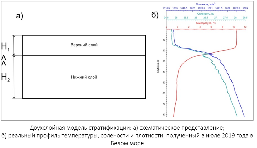 - Двухслойная модель стратификации: схематическое представление [Атлас океанов, 1996] и реальный профиль температуры, солености и плотности, полученный в июле 2019 года в Белом море [сост. автором].