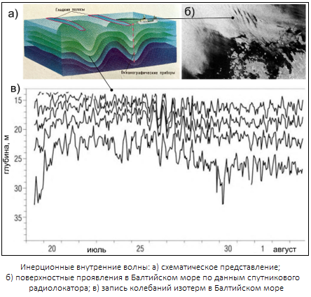 - Инерционные внутренние волны: а) схематическое представление [Атлас океанов, 1996]; б) поверхностные проявления в Балтийском море по данным спутникового радиолокатора [Axell, 2002]; в) запись колебаний изотерм в Балтийском море [Axell, 2002].