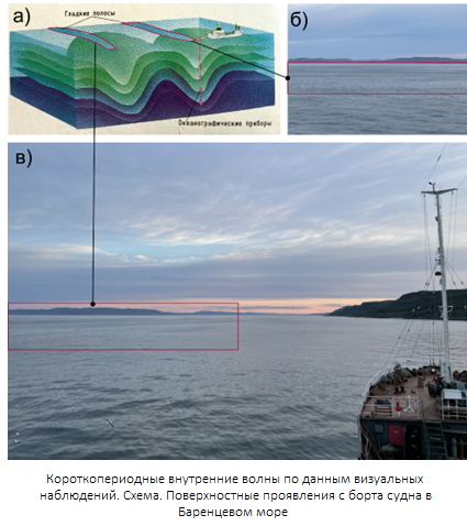 - Короткопериодные внутренние волны по данным визуальных наблюдений: а) схематическое представление [Атлас океанов, 1996]; б-в) поверхностные проявления – вид с борта судна в Баренцевом море [фото автора].