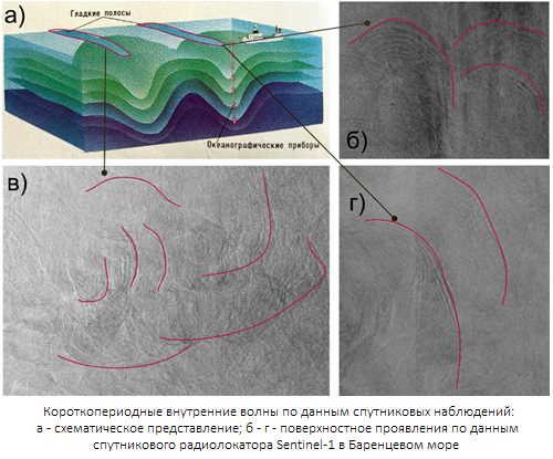 - Короткопериодные внутренние волны по данным спутниковых наблюдений: а - схематическое представление [Атлас океанов, 1996]; б - г – поверхностные проявления в Баренцевом море по данным спутникового радиолокатора Sentinel-1 [Данные – ESA, обработка Свергун Е.И].