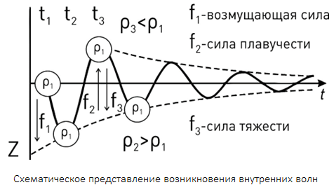 Чтобы усвоить определение внутренних волн, представьте ситуацию, когда в устойчиво стратифицированной жидкости (плотность возрастает по глубине Z) на некоторой глубине в момент времени t1 из положения равновесия некоторой силой f1 выведен вертикально вниз некоторый объем жидкости с плотностью ρ1.