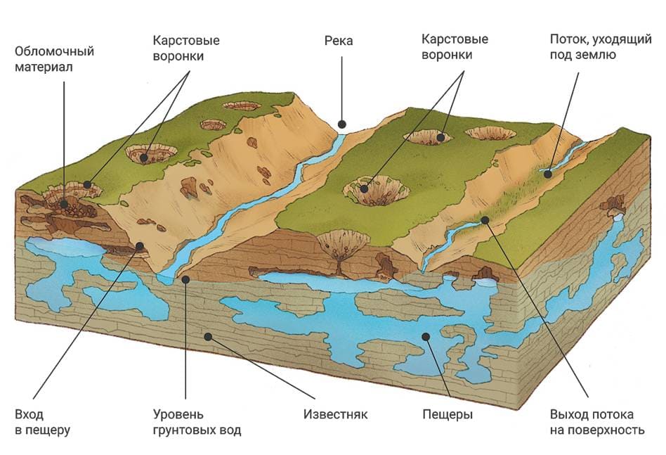 Поверхностный и подземный карст. Схема. Карст. [Электронный ресурс]. URL: https://prirodainfo.ru/wp-content/uploads/2021/05/karst-formy-reljefa.jpg (дата обращения: 11.02.2023).