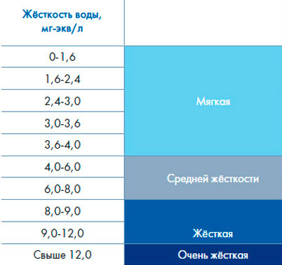 - мягкие – с жесткостью до 4 мг-экв/л, в том числе мягкие с жесткостью 0–1,5 мг-экв/дм³ и питьевые с оптимальной жесткостью 1,5–2 мг-экв/дм³;