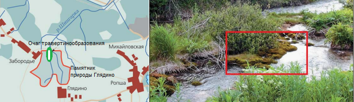- Очаг современного травертиногенеза в ручье Ривкузи на территории памятника природы Глядино [Колокольцев и др., 2014, с. 21].
